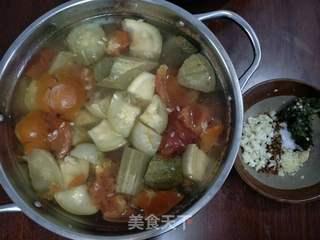 4. 汤煮至半熟时,加入洋瓜块、胡萝卜块、青豆,继续炖煮。